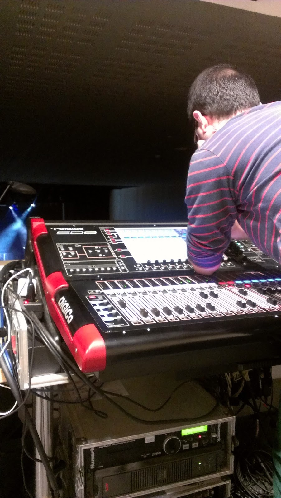 El dimecres es va fer el montatge del bolo, tirades de cables, intercoms i unes proves de so amb els artistes que poden venir. Atril, una coral, en Joan Dausà, i els sardanistes. Tot i això vam fer el check de totes les línies tirades, envios i senyals. Ja se sap, com més es faci al primer dia, més tranquils anirem a l'endemà. Aquí unes fotos amb l'Oscar (llums), check de projector, i revisant l'escaleta final.
